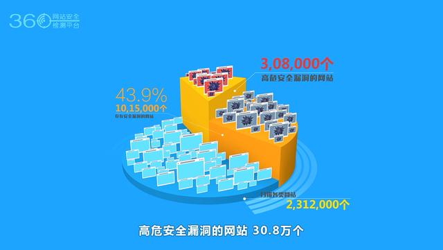 根據360互聯網中心發布的《2015年中國互聯網安全報告》,2015年全年(截至11月18日),360網站安全檢測平臺共掃描各類網站231.2萬個。其中,掃出存在漏洞的網站101.5萬個,占比為43.9%,較2014年的61.7萬個增長了64.5%。其中掃出存在高危漏洞的網站30.8萬個,較2014年的27.9萬個增長了10.4%。從漏洞數量來看,360網站安全檢測平臺平均每月掃出高危漏洞約24.1萬次;平均每天掃出高危漏洞約0.8萬次。