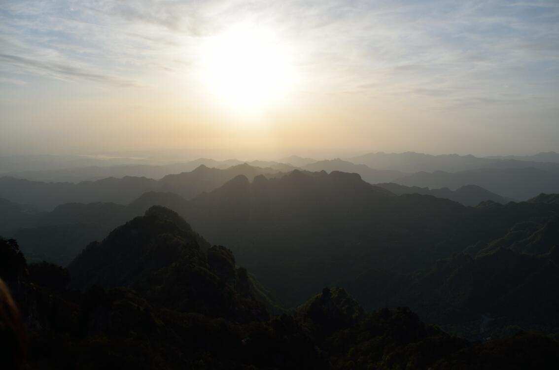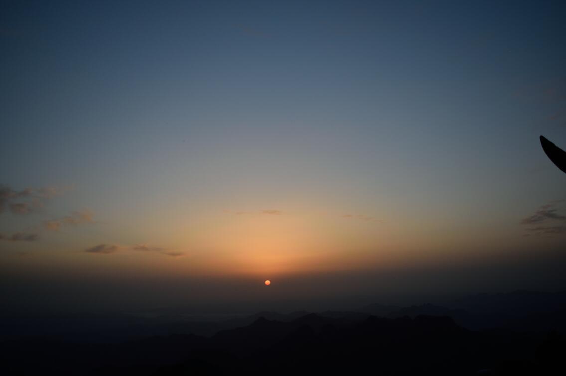 翌日凌晨三點,酒店外漆黑一片,偶有燈光,看到很多游客也相約凌晨爬山。我們也整裝向金頂出發,一路上攀爬辛苦,也無法欣賞沿山美景,但卻是一種全新的體驗。隨著大家的步伐,海拔逐漸升高,霧漸在腳下,天空由灰漸藍,一切清新縹緲。天空中出現一絲絲彩霞,太陽也從云層里露出了笑臉,日出美極了,遠處的山峰也若隱若現,三個小時便登上了金頂,海波1612米的地方,站在武當之巔,俯視眾生,或閉目冥思,感悟天下大道!