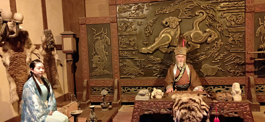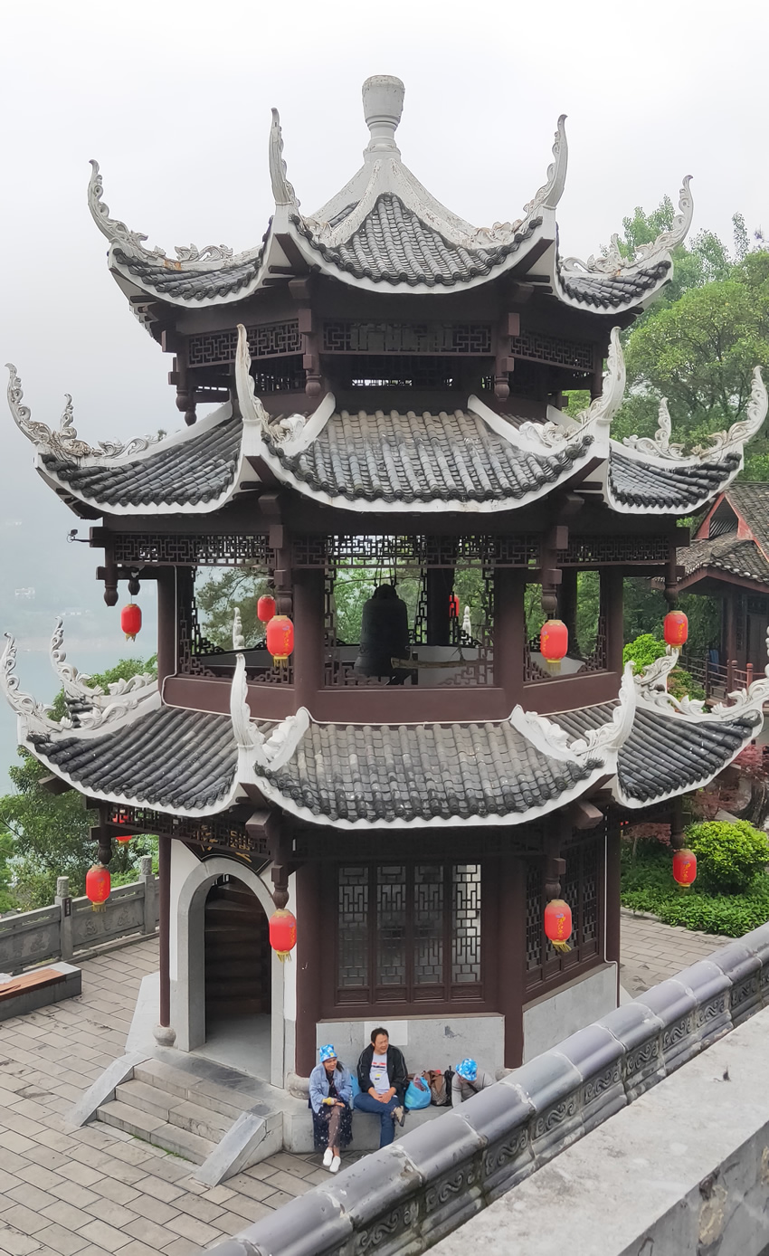 之后我們返回當(dāng)陽(yáng)頭碼頭登船前往燈影閣碼頭,乘坐扶梯去往巴王寨。巴王寨是用石頭、原木和泥土作為原材料建筑而成,記錄并呈現(xiàn)了一個(gè)民族從興盛到衰弱的歷史過(guò)程,沿路看到磨石、雕刻等具有農(nóng)耕風(fēng)情的巴人生活,古色古香。然而老天下起了雨,大家狼狽前行,錯(cuò)過(guò)了燈影石的好風(fēng)光。不過(guò)有兩位穿著巴人服飾的大叔在雨中駐守于巴王宮外,繼續(xù)扮演他們的“角色”,相當(dāng)敬業(yè)。巴王宮內(nèi)刀槍劍戟擺在中堂兩側(cè),一股肅殺之氣沖天而起,巴王端坐在殿中,旁邊是巴王女兒。雖然這是人造的仿古景點(diǎn),但似乎有那么點(diǎn)意思。聽另一位導(dǎo)游說(shuō),如果不下雨的話,每天都會(huì)有古巴人風(fēng)情的仿古舞蹈表演,很好看,不禁感到遺憾。不過(guò)我們還聽了蘭曲,看了十分鐘的女書小劇場(chǎng),各有特色。