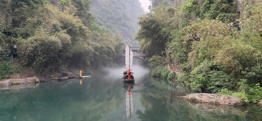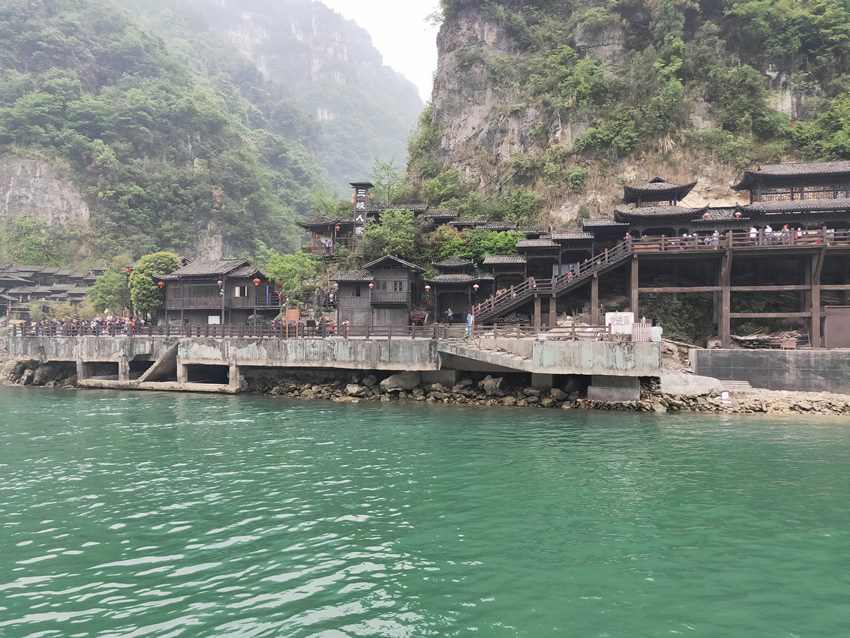 下船第一站-當(dāng)陽(yáng)頭碼頭,這里是游客中心,有很多餐館,我們跟隨導(dǎo)游吃過(guò)飯后便前往第一個(gè)景點(diǎn)-水上人家。穿過(guò)售貨長(zhǎng)廊,便看到了龍進(jìn)溪:正對(duì)溪口的江北山崖上,一條帶狀石嶺從山頂蜿蜒而下,快臨江時(shí)向上高高翹起如一條巨龍,龍頭所向,像要跳進(jìn)南岸的清溪內(nèi),龍進(jìn)溪因此而得名。岸邊幾只古帆船迎風(fēng)而立,纖夫們?cè)诮泻爸H為熱鬧。這里溪水清綠,林木蒼翠,不遠(yuǎn)處還有土家族打扮的紅衣姑娘撐著紅傘站在船頭,后面還有人工制造的仙氣圍繞,真的是“龍溪橋下春波綠,驚鴻拂面照影來(lái)”。