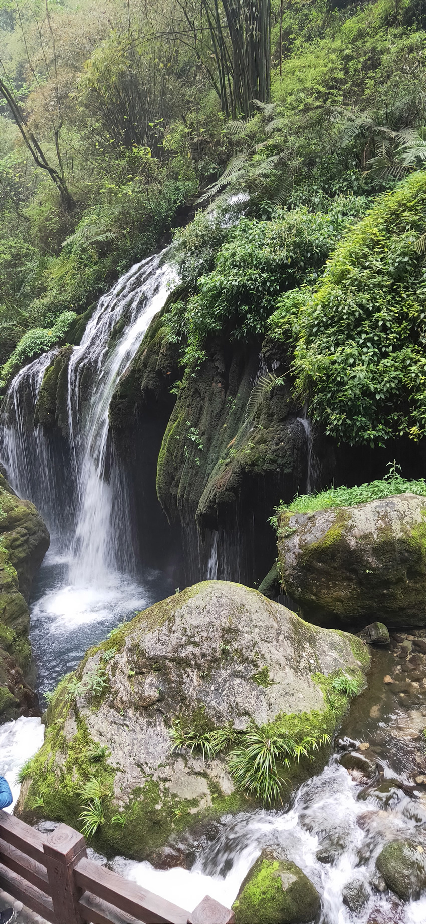 這里一半著陸,一半入水,青山綠水之間,景色如畫。一路上能看到溪里的小魚、小鵝,溪邊洗衣服的大嬸和蕩舟的幺妹子,還有衣著古風(fēng)的美女在閣樓里彈琴,盡顯當(dāng)?shù)叵先思业娜粘I睢=又覀儊?lái)到了“鵲橋”,婚嫁表演的閣樓,可惜當(dāng)時(shí)站在閣樓最左側(cè),未能完全觀賞。印象最深刻的是男扮女裝的媒婆,拿著一個(gè)大煙桿左右搖擺地走下來(lái),整個(gè)表演比土家打扮的姑娘們細(xì)致、入戲得多,哈哈。最后是黃龍瀑,水流從對(duì)面山崖一個(gè)山洞流出,呈扇形展開,傾瀉而下,匯入崖下的深潭,水聲如雷貫耳,響徹山谷,讓人神清氣爽,忍不住留念合影。
