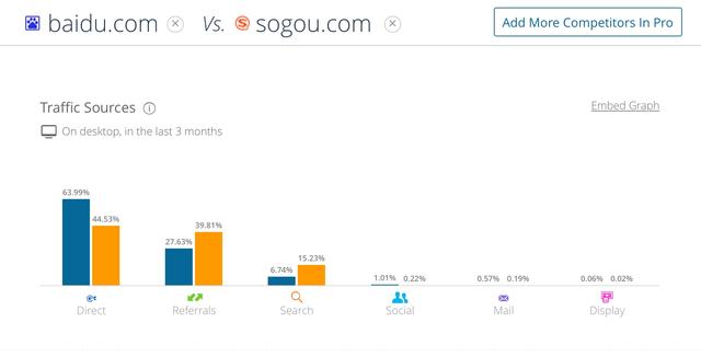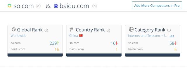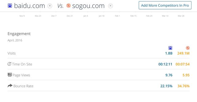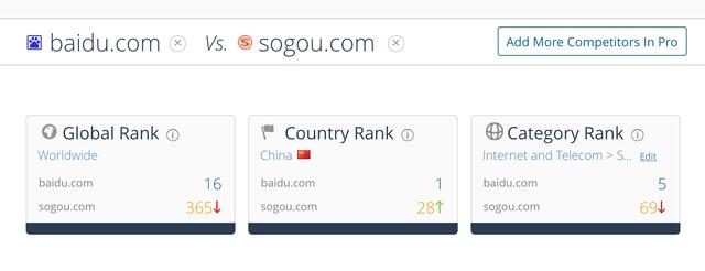 全球所有的網站中,百度綜合排在第16位,搜狗排在第365位;