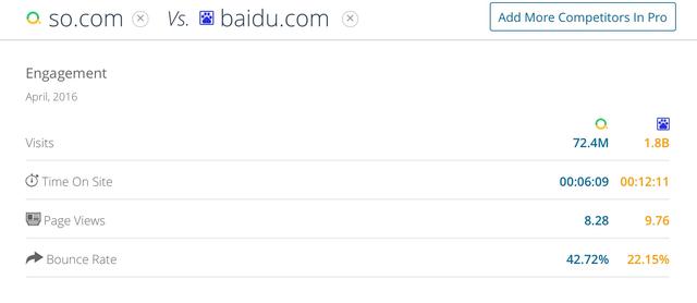 網站流量方面,從圖上看360和搜狗很接近,但真實情況搜狗是絕對大于360的,總之和百度的差距同樣是十幾倍。