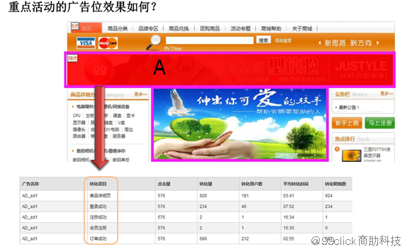 站內廣告運營分析不僅僅是對站內重點活動的區域、圖片進行分析,還可以分析整個網頁每一個區域所帶來的點擊、轉化等數據。對于電商運營人員來說,通過綜合分析各個區域的數據,掌握用戶的需求和關注度,及時調整優化廣告位,使其實現最大價值,這也是提升銷量最有效的途徑!