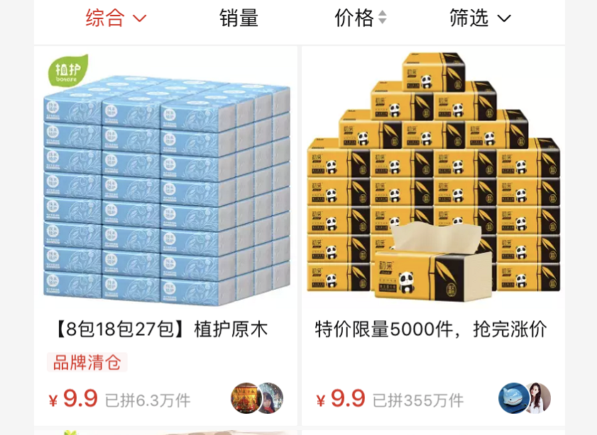 三、四、五線城市人群,以低價(jià)大量拉取用戶。比如,紙巾不到9塊能買到5.5斤。在2018年,論斤賣的紙還能上哪兒找去啊?真正的四舍五入不要錢(qián),免費(fèi)買紙用半年。雖然也不是什么好牌子,但是真便宜,跟撿似的。如果做個(gè)什么小生意,開(kāi)個(gè)小餐館什么的,這紙還真挺劃算的。
