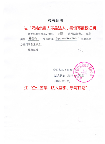 5、網站備案授權書(法人簽字,加蓋公章)( 注:當網站負責人與法人為同一人時,不需要此表)點擊下載